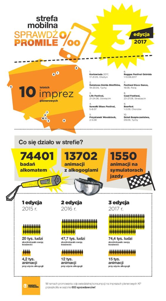 Wherever the interest in sobriety check-ups is the greatest, e.g. at the Woodstock Festival, which gathers several thousand people every year, KP tends to cooperate with some partners. One of them is a producer of breathalysers – Promiler. During the Woodstock Festival, the breathalyser tests are conducted in cooperation with the Police.
