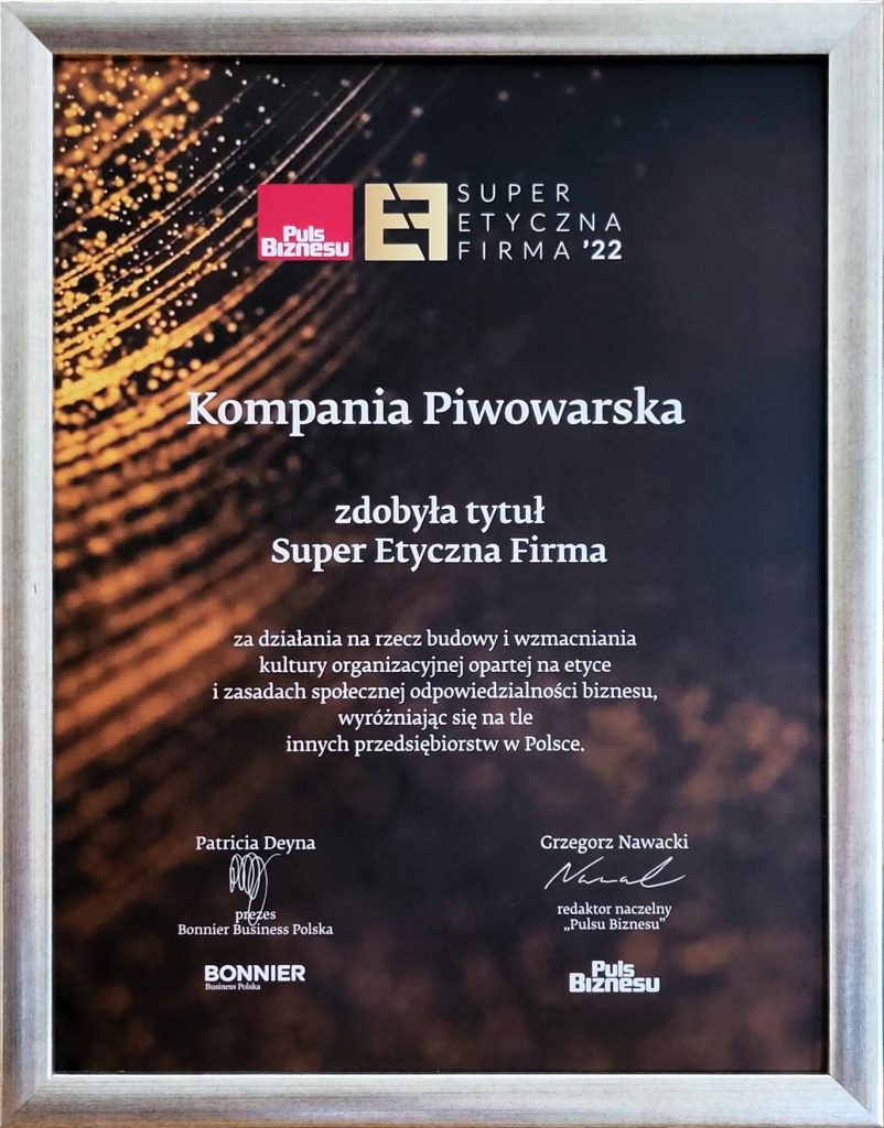 – Tytuł „Super Etyczna Firma” to wyraz uznania dla pracowników Kompanii Piwowarskiej. Swoim zachowaniem, uczciwością i zaangażowaniem w podejściu do klientów, konsumentów, dostawców, swoją troską o środowisko i innych ludzi, a w szczególności o społeczności lokalne, w których działamy, tworzą kulturę organizacyjną bazującą na etyce, tworząc więzi, które mają znaczenie – powiedziała Beata Zduńczyk-Golędzinowska, Menadżerka Komunikacji Korporacyjnej w Kompanii Piwowarskiej, odbierając wyróżnienie.