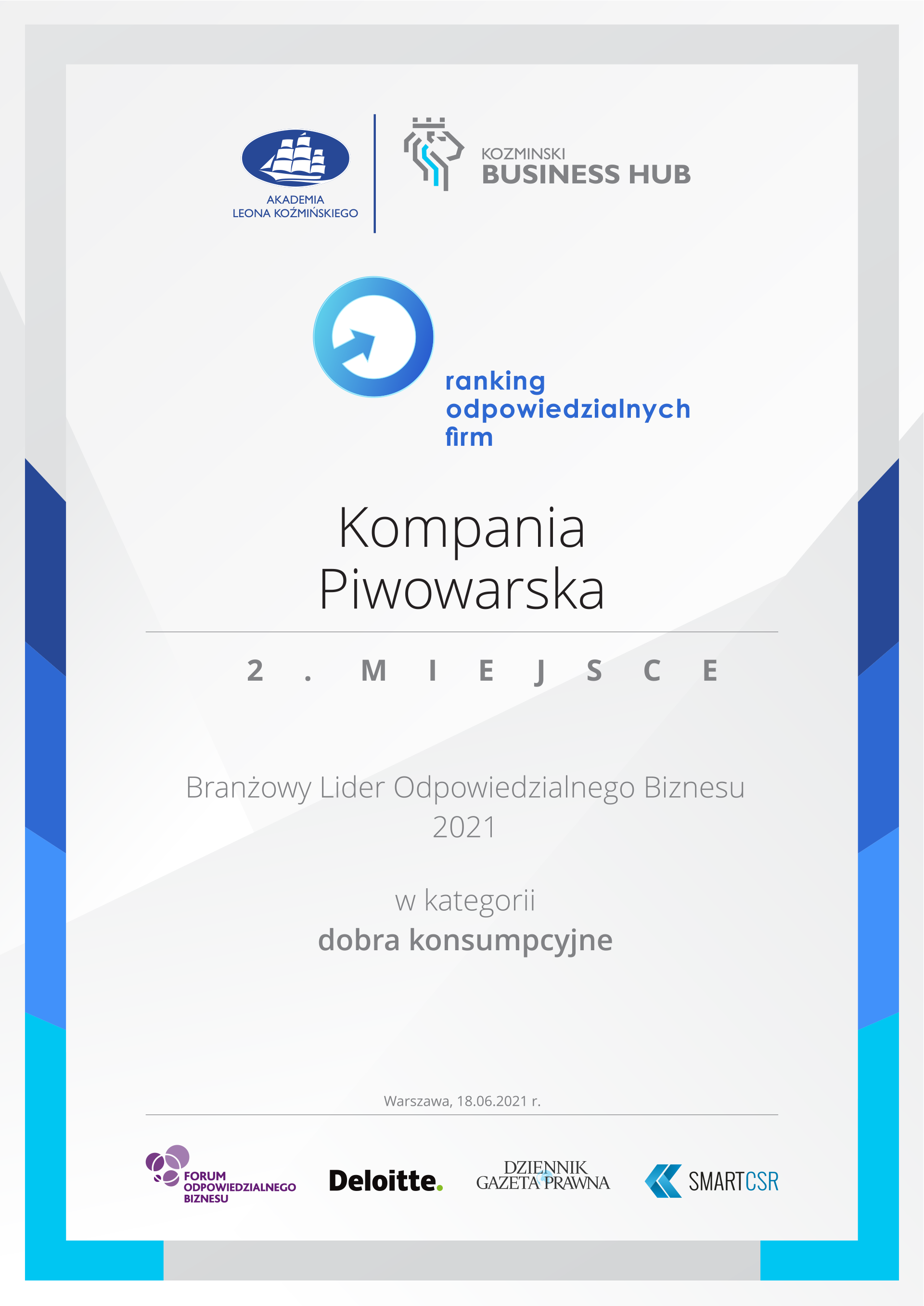 – Czujemy dumę i satysfakcję, że po raz kolejny zostaliśmy wyróżnieni w prestiżowym Rankingu Odpowiedzialnych Firm. Nasza obecność na tak wysokiej pozycji zestawienia, zwłaszcza w roku kryzysu COVID-19, który postawił przed nami wyzwania z jakimi mierzyliśmy się po raz pierwszy, pokazuje, że Kompania Piwowarska nie tylko potrafi stanąć na wysokości zadania w nadzwyczajnej sytuacji, ale też bez względu na zmienne okoliczności zewnętrzne konsekwentnie realizować założenia firmowej strategii Lepsza Przyszłość 2030. Wszyscy zdajemy sobie sprawę, że nasze obecne wysiłki kształtują przyszłość dla nas i następnych pokoleń. Globalnie mierzymy się z problemami, z powodu których odpowiedzialność społeczna i zrównoważony rozwój nabrały szczególnego znaczenia. Szczególnie cieszy nas pozycja nr 3 w zestawieniu najlepszych firm w ostatnich 15 latach, bo to dowód na naszą konsekwencję w działaniu z poszanowaniem wszystkich interesariuszy, otoczenia i środowiska naturalnego. Dla naszej firmy są to wartości kluczowe i integralne części naszej strategii biznesowej. – skomentowała Iwona Jacaszek-Pruś, dyrektorka ds. korporacyjnych w Kompanii Piwowarskiej.