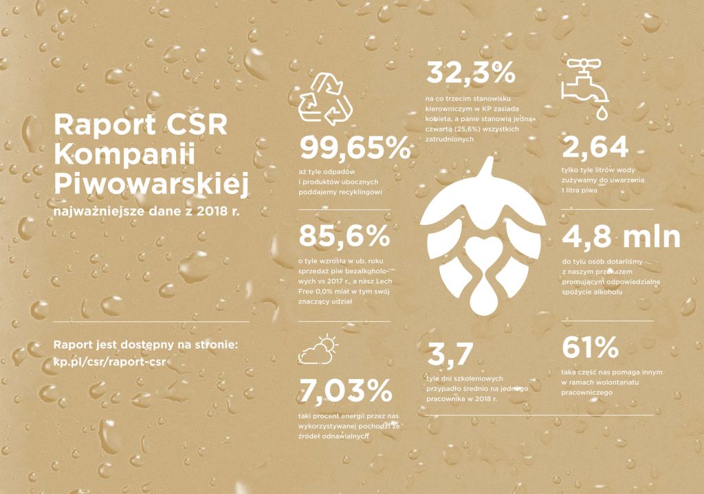 Raport CSR za 2018 r. pokazuje wkład firmy w realizowanie 13-tu spośród 17-tu celów zrównoważonego rozwoju ONZ. Strategia zrównoważonego rozwoju Kompanii Piwowarskiej skupiona jest na 3 obszarach, tj. produkty i zdrowie; ludzie i społeczeństwo; środowisko naturalne. W ich ramach firma realizuje m.in. programy na rzecz odpowiedzialnej konsumpcji alkoholu, dba o społeczności lokalne oraz zapewnia świetne warunki pracy i rozwoju swoim pracownikom, oszczędza wodę, energię i zapewnia niemal 100% recyklingu swoich odpadów i produktów ubocznych.