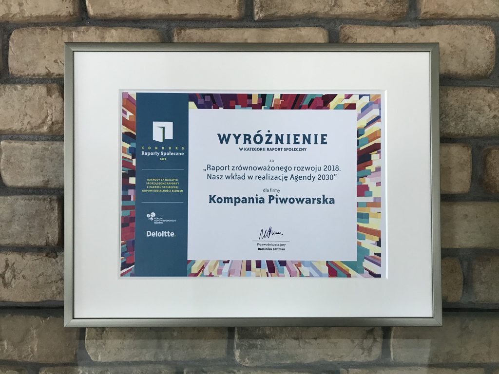 „Raport zrównoważonego rozwoju. Nasz wkład w realizację Agendy 2030” Kompanii Piwowarskiej został wyróżniony w tegorocznej edycji prestiżowego konkursu „Raporty Społeczne”. Jury doceniło przystępną, skrótową formę zawierającą kluczowe informacje, walor edukacyjny oraz odważne zmierzenie się z trudnym tematem oddziaływania na otoczenie. To jedyne tegoroczne wyróżnienie dla zgłoszonych raportów społecznych.