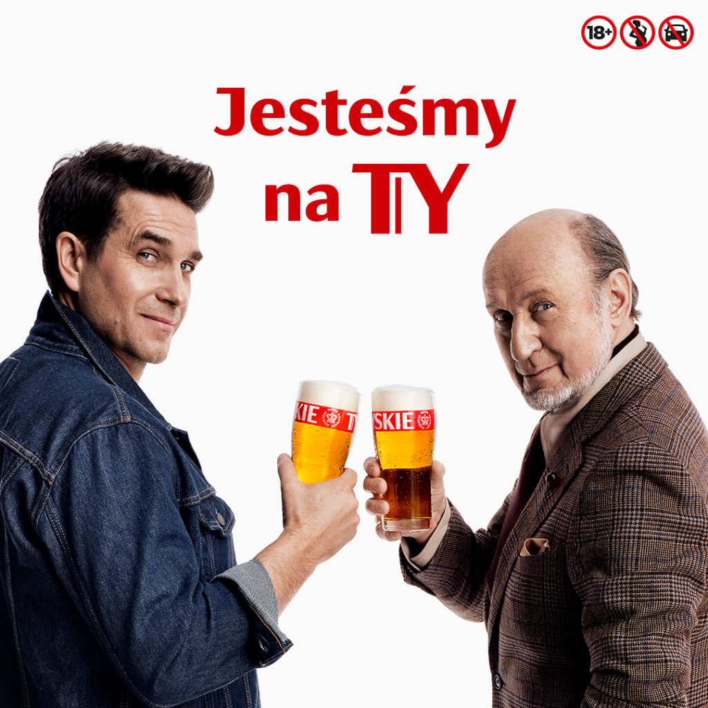 Nowa komunikacja 360° z hasłem „Jesteśmy na TY” pogłębia przekaz platformy marki Tyskie Kompanii Piwowarskiej. Głównym nośnikiem kampanii są spoty z udziałem Piotra Fronczewskiego i Marcina Dorocińskiego. Ich autentyczne spotkanie obrazuje ponadczasową esencję marki.