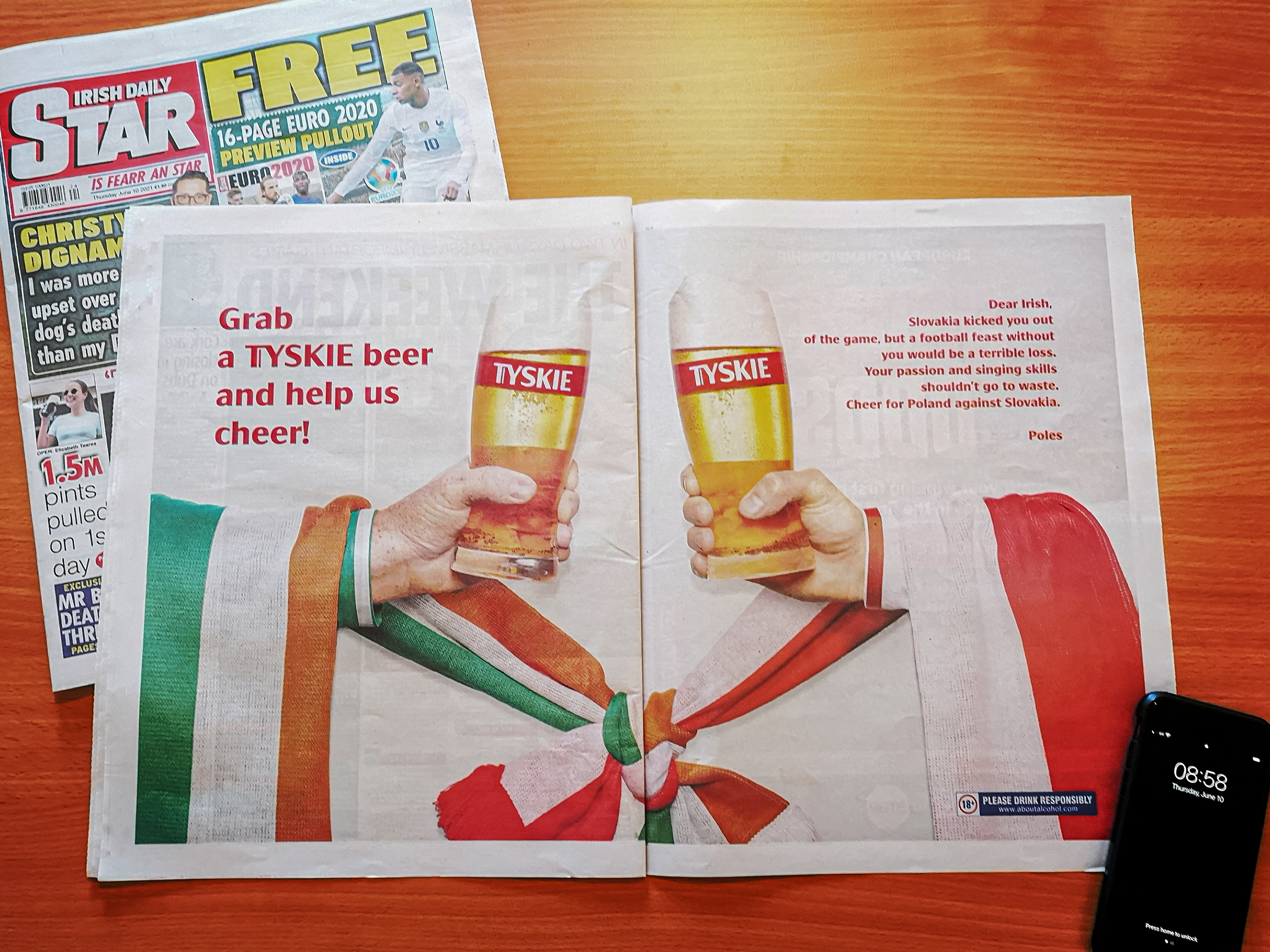 Tyskie postanowiło poprosić kibiców Irlandii o wsparcie. W dzienniku Irish Daily Star ukazał się apel, w którym marka pod hasłem Grab a Tyskie beer and help us cheer! (pol. Złap Tyskie i pomóż nam kibicować) zachęca Irlandczyków do przejścia na TY i dopingowania biało-czerwonych. Taka sama reklama ukazała się również w dzienniku Irish Daily Mirror.